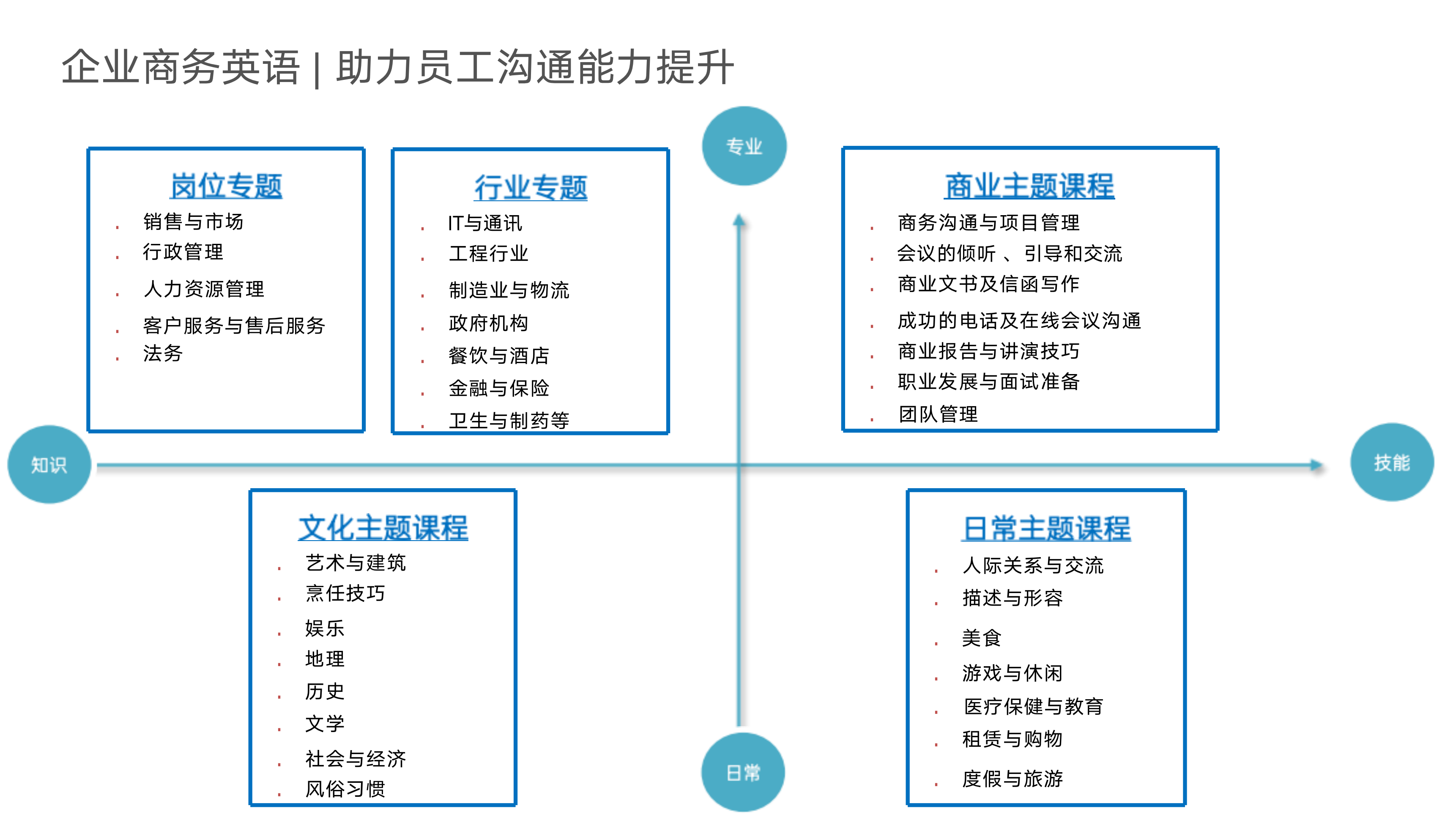 通过对岗位专题、行业专题、文化主题课程、商业主题课程、日常主题课程的多方面全面培养